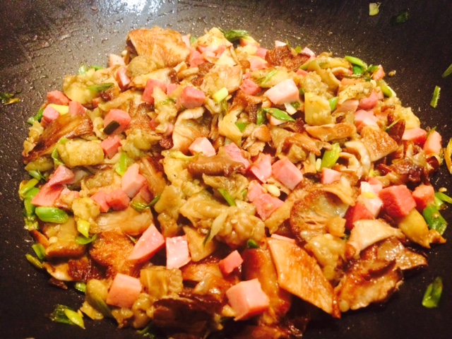 Rehogar toda la mezcla durante un par de minutos y añadir las setas cortadas en trozos, rehogar otro par de minutos y tendremos el relleno listo para nuestras berenjenas.