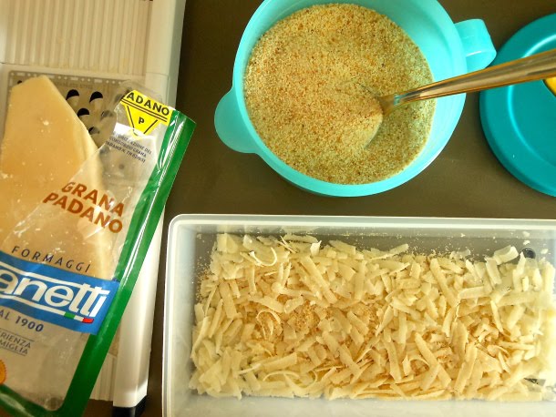 Luego ralla el queso parmesano y mézclalo con las cuatro cucharadas de pan rallado y con una cucharadita de orégano.