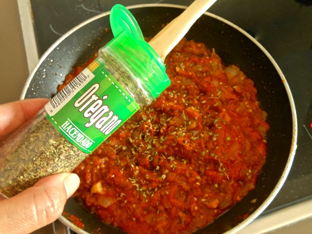 Tras esto añade las cuatro cucharadas de tomate frito y una cucharadita de orégano. Remueve bien y déjalo hacer durante 4 minutos a fuego-medio. Rectifica de sal si esto fuera necesario.
