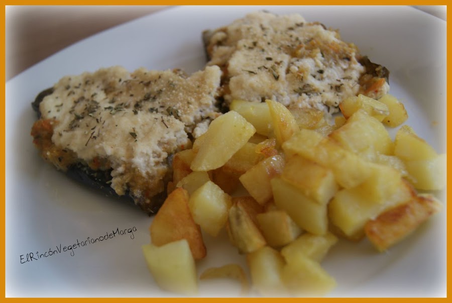 Quitamos el rabito a las berenjenas y las hervimos en agua con sal hasta que queden blandas. Pelamos la chirivía, las zanahorias y el nabo. En un robot, picamos todos los ingredientes y los sofreímos en una sartén honda con un buen chorro de aceite de oliva. Cuando el aceite se consuma, añadimos un vaso de agua y dejamos que se consuma. Escurrimos las berenjenas y las dejamos enfriar, para proceder a vaciarlas. El interior de las berenjenas lo vertemos con el resto de ingredientes del sofrito. Lo mezclamos bien e incorporamos un chorro de tomate frito. Salpimentamos. Rellenamos las berenjenas con el relleno y en la parte superior las untamos con la bechamel de almendras. Espolvorear con pan rallado por encima de la bechamel y hornear unos 15 minutos a 180º.