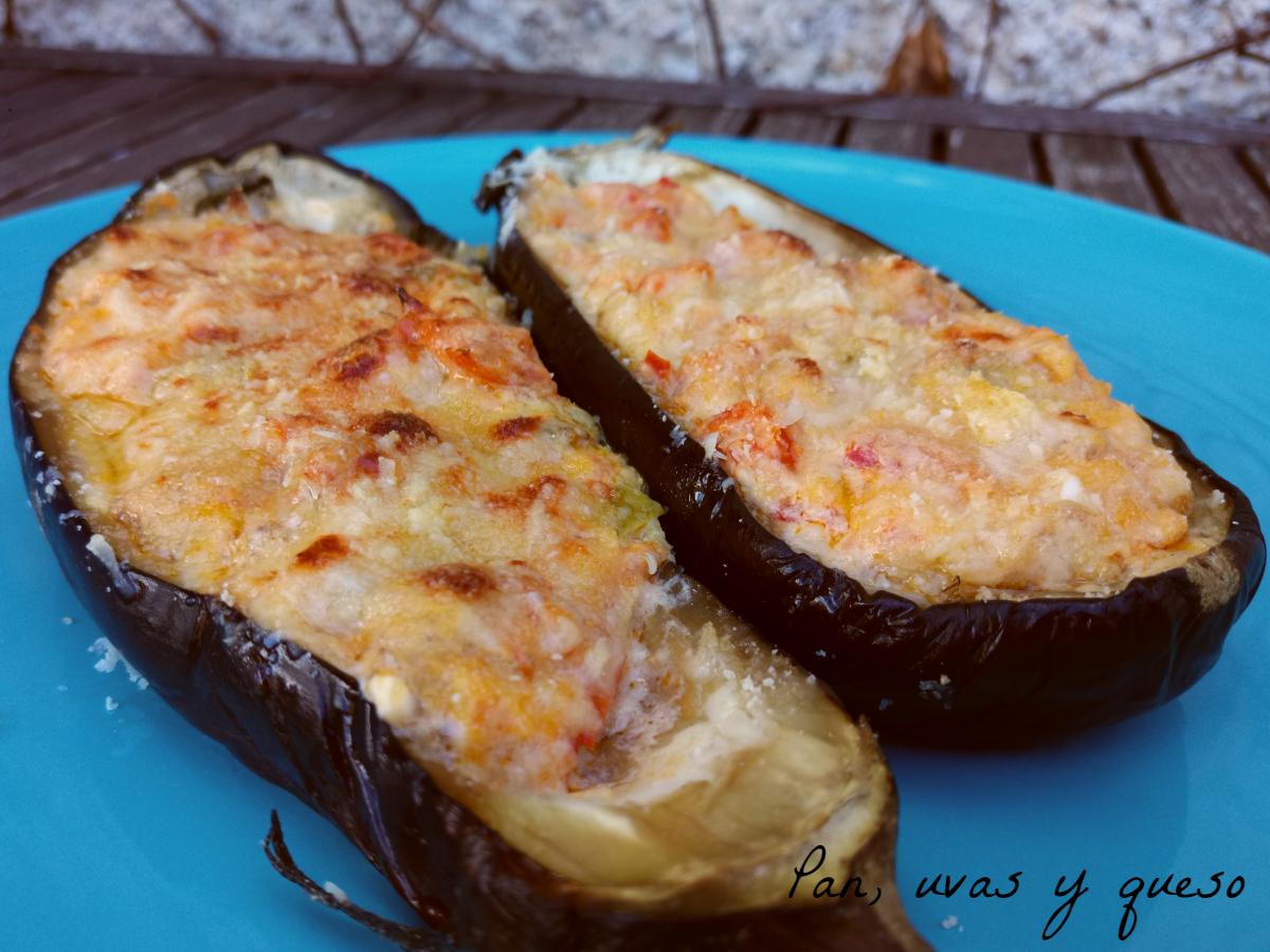 Cuando las verduras estén hechas, añadimos el queso de untar y mezclamos todo. Rellenamos las berenjenas con esta mezcla, cubrimos con queso Parmesano rallado y un poco de pan rallado y las metemos en el horno hasta que el queso rallado esté fundido.