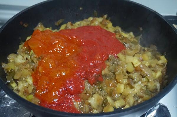 Cuando esté todo mezclado echaremos el tomate triturado y el frito, la cantidad será a gusto de cada uno, si te gusta con más tomate o menos.