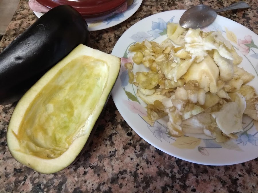 2⃣con ayuda de una cuchara, vaciamos las mitades de la bernjena y las dejamos como si furan barquitas. La carne que retiramos la reservamos en un plato para luego.