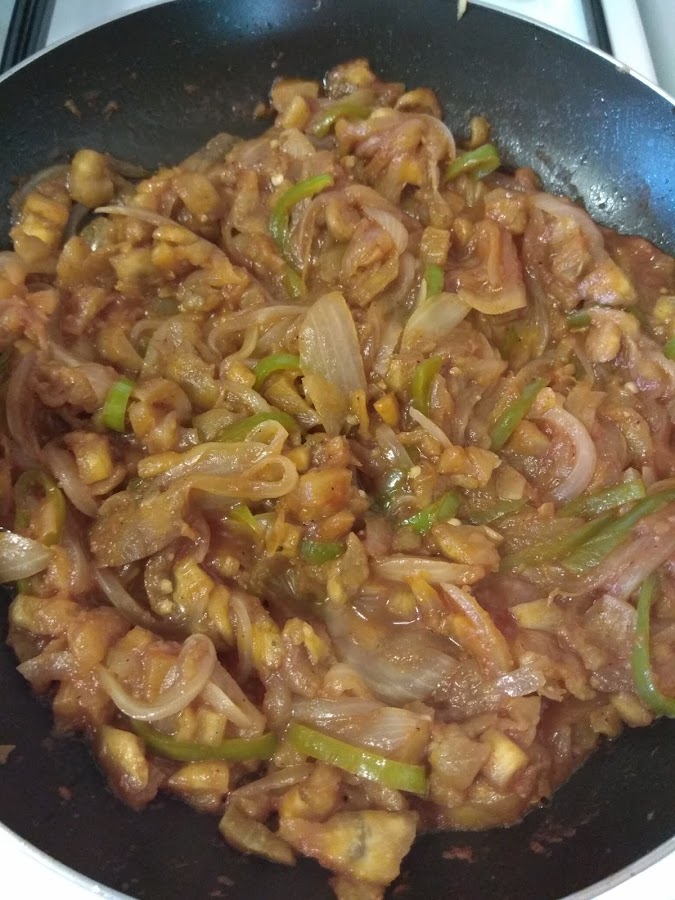 3⃣ahora en una sarten ponemos un poco de aceite con la cebolla y el pimiento cortado en juliana. Le añadimos tambien la carne de la berenjena que habiamos reservado picadita.