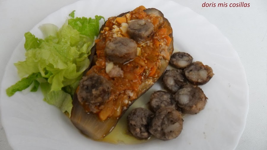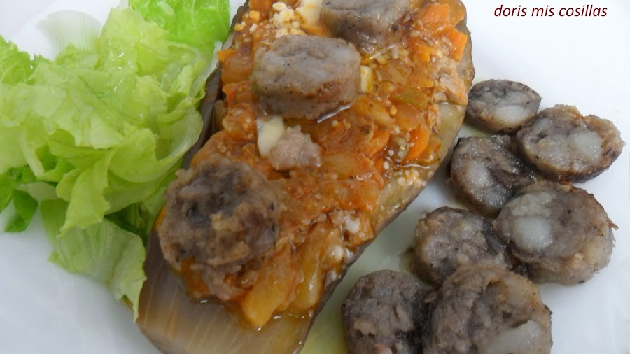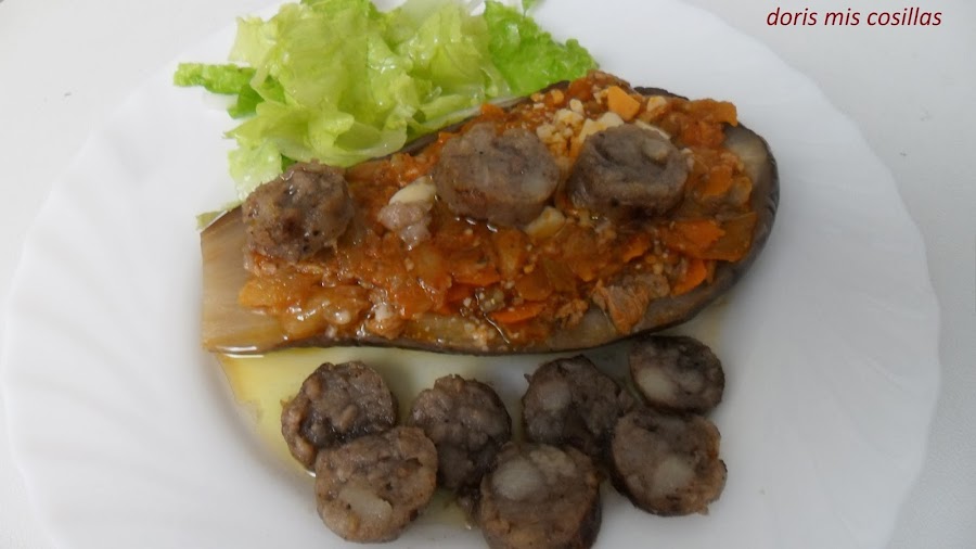 Rellenamos las berenjenas con el sofrito, añadimos el huevo cocido picado y adornamos con la butifarra reservada y ensalada verde.