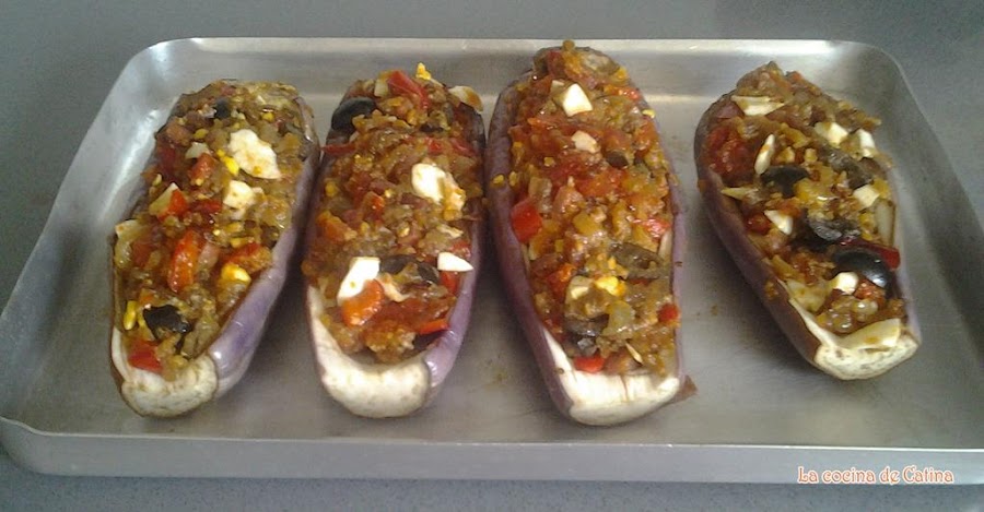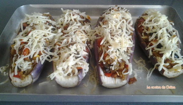 Mientras preparábamos el relleno, he cocido las barquitas de berenjenas en el microondas de dos en dos, 4 minutos a máxima potencia. Una vez cocidas las rellenamos con el preparado que tenemos reservado,