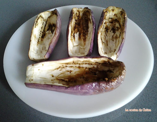 Cortar las berenjenas en sentido longitudinal y extraer la pulpa.
