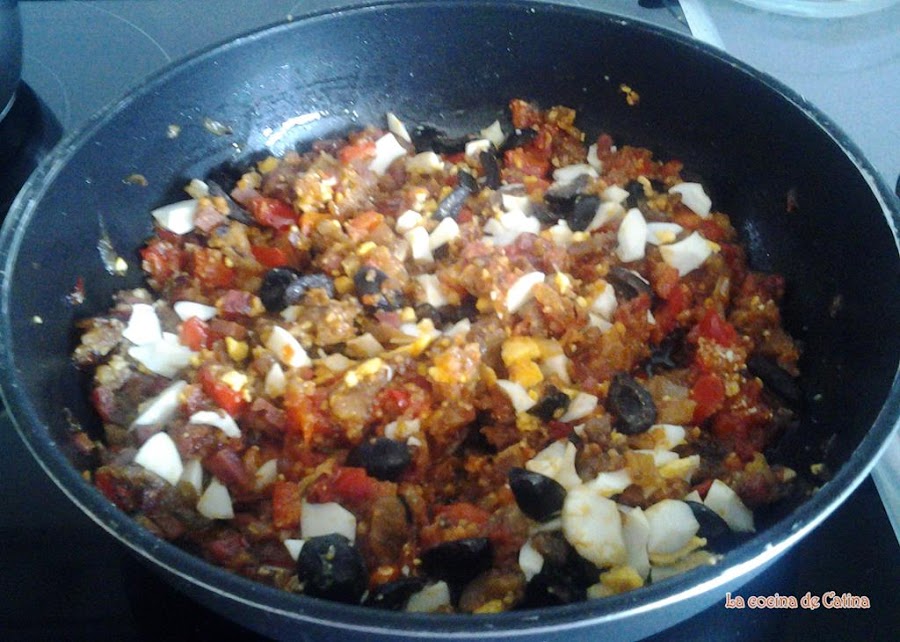 Añadir el pan rallado, las aceitunas cortadas en trocitos y el huevo duro rallado, mezclar todo bien y reservar.