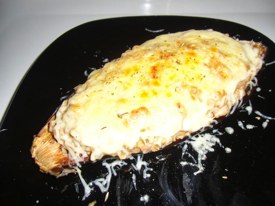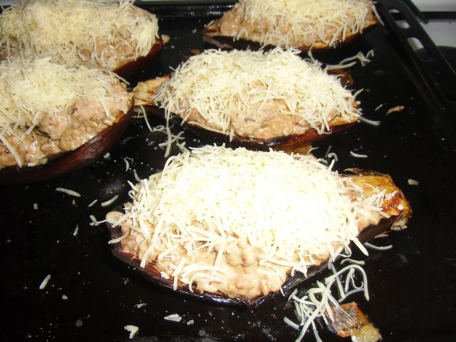 Rellenamos las berenjenas con la mezcla y las cubrimos con queso rallado por encima.