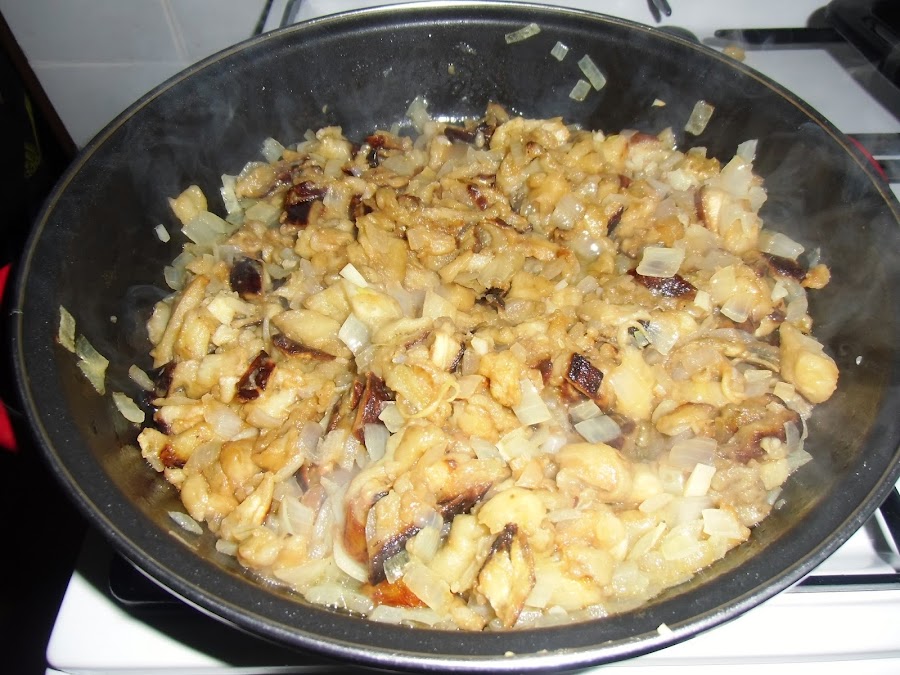 Cuando la cebolla esté bien pochada añadimos la carne de las berenjenas y mezclamos todo bien