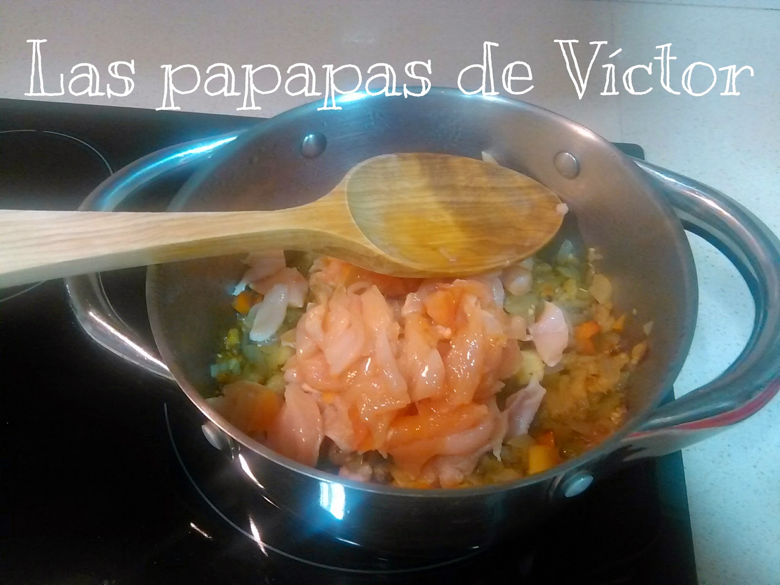 Cuando este pochada la verdura añadiremos el pollo cortados con las tijeras, que aunque después lo pasaremos por la turmix es para no sobrecargarla demasiado.