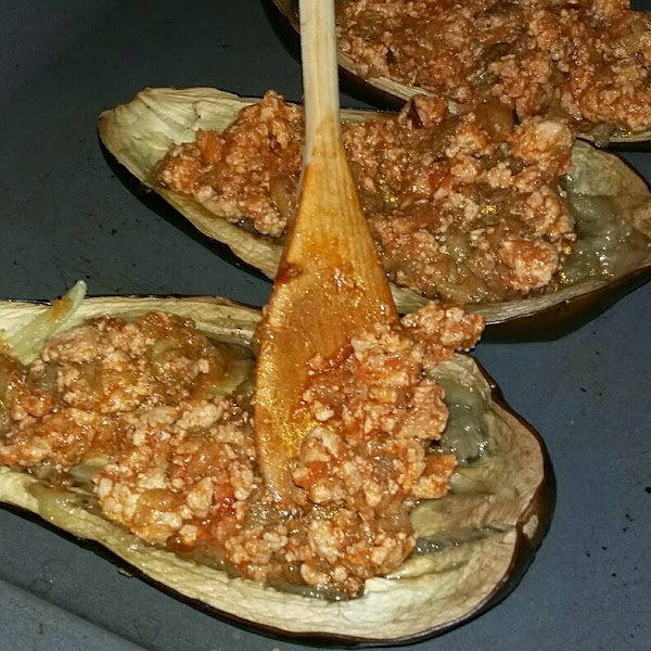 Cuando veamos que el relleno está bien cocinado, rellenamos las pieles de las berenjenas.