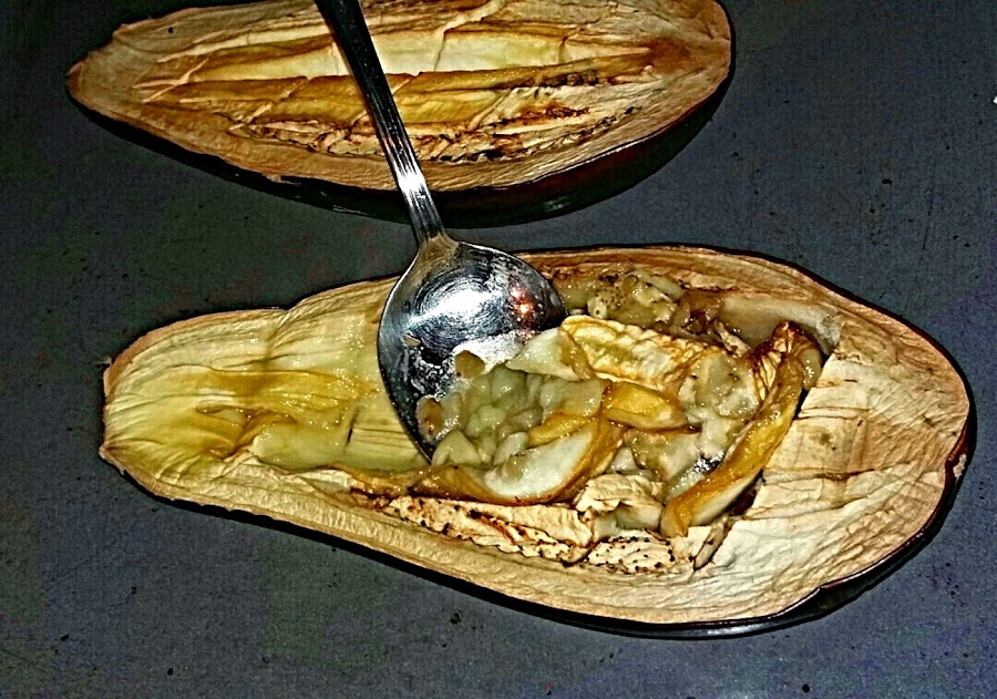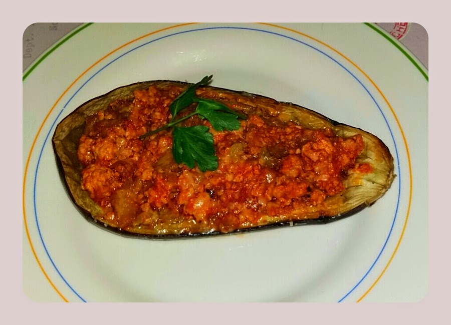 Cuando veamos que las berenjenas están blanditas las sacamos del horno y vaciamos las mitades echando la carne de la berenjena con la carne picada y removemos.