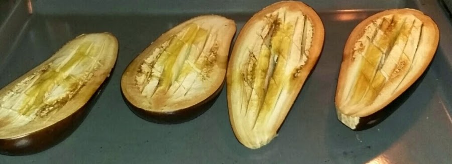 Cortamos las berenjenas en dos a lo largo, las hacemos unos cortes y le echamos un poco de aceite para meterlas en el horno calentado previamente a 200º.