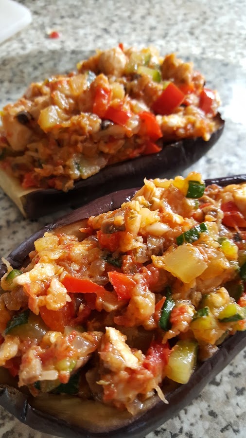 BERENJENAS RELLENAS DE POLLO, PISTO Y CHAMPIÑONES
