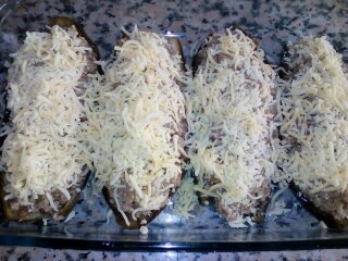Rellenamos las berenjenas y cubrimos con el queso rallado.