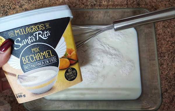Precalentamos el horno a 200°C calor arriba y abajo. Vamos a preparar la bechamel instantánea. Ponemos 450 ml de leche fría y añadimos 68 gr de Mix Bechamel Instantánea en Frío poco a poco sin dejar de remover con una varilla manual para que nos quede cremosa y sin grumos. Podéis añadir un poco más de leche si queréis que os quede más líquida (opcional) pero al ser berenjenas os recomiendo que os quedé un poco más densa para que sea fácil de añadir sin desparramarse. Añadimos una pizca de sal y removemos. Con esta cantidad sale aproximadamente medio litro de bechamel.