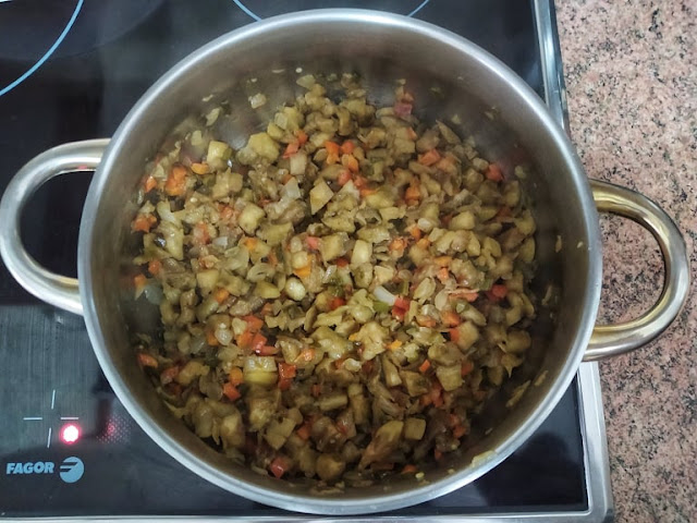 Añadimos la carne de las berenjenas a la sartén, junto al resto de verduras, con una pizca de sal. Cuando las verduras estén blanditas añadimos la carne picada y una pizca de sal, removemos y dejamos que se cocine poco a poco.