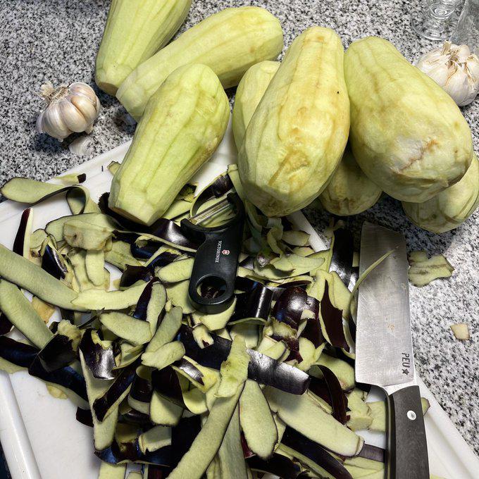 Pelar berenjenas y cortarlas en rodajas, al bies, como cortando un salamín, pero no muy finas, yo las dejo de 1cm de ancho. Esta vez no las deje en sal unas horas, la diferencia es muy sutil como para que sea relevante.