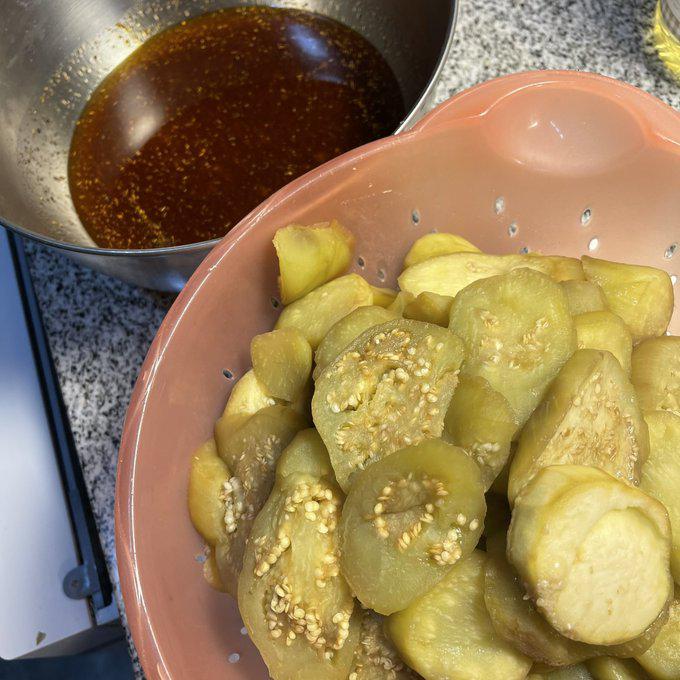 Tapar parcialmente la cacerola y esperar 3 minutos exactos, no mas, no menos. A los 3 minutos, sacar rápidamente todas las berenjenas y van metiendolas en un colador. Repetir con todas las rodajas. Hoy hice dos kilos y fueron mas o menos 6 o 7 tandas.
