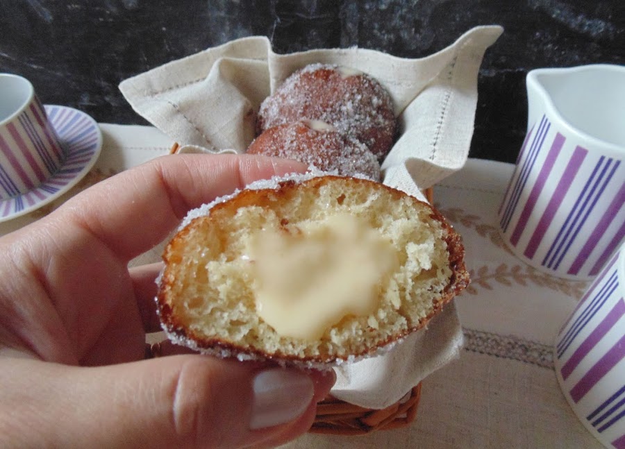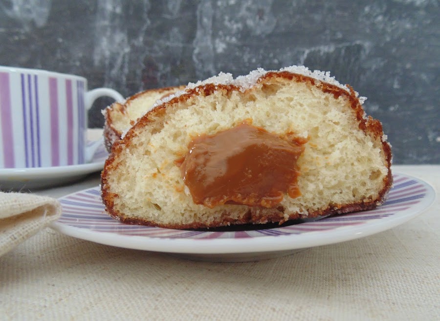 Y al fin llega el momento de freír, para lo que recomiendo usar una sartén pequeña, o mejor aún, un cazo pequeño, en el que friamos las berlinas de una en una y bien sumergidas en el aceite… bueno, en realidad flotan, pero ya me entendéis, quiero decir que no les falte aceite y que no toquen nunca el fondo del recipiente. Para que no se deformen no tocaremos la masa con las manos, sino que cogeremos el papel sobre el que colocamos la masa y meteremos todo, papel y masa en el aceite de freír. Con unas pinzas retiraremos el papel y freiremos cada berlina durante un par de minutos de cada lado. En cuanto las sacamos del aceite, las rebozamos en azúcar y las dejamos enfriar sobre una rejilla. Una vez están frías podemos rellenarlas con una manga pastelera con boquilla para rellenar (que es esa tan larga) utilizando para ello la crema que más nos guste: yo rellené unas con la misma crema de limón que prepare cuando hice esta receta, otras con dulce de leche, otras con crema pastelera (podéis encontrar la receta aquí), y otras con crema de chocolate… ¡así todo el mundo puede comer la que más le guste!