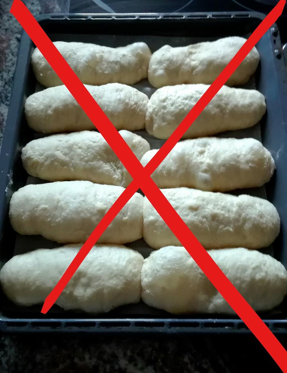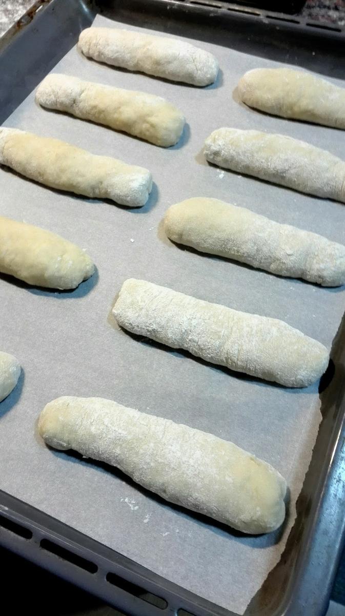 Desgasificamos, dividimos la masa en 9 porciones similares y les damos forma como si hicieramos una barrita de pan.