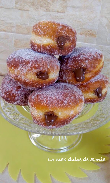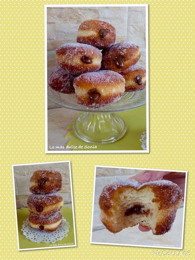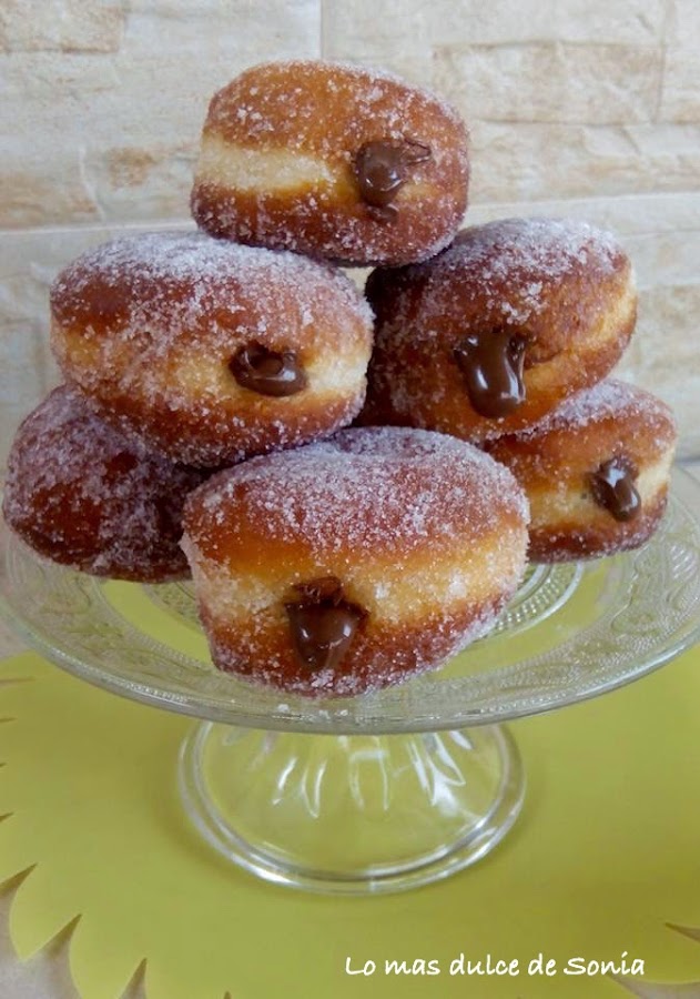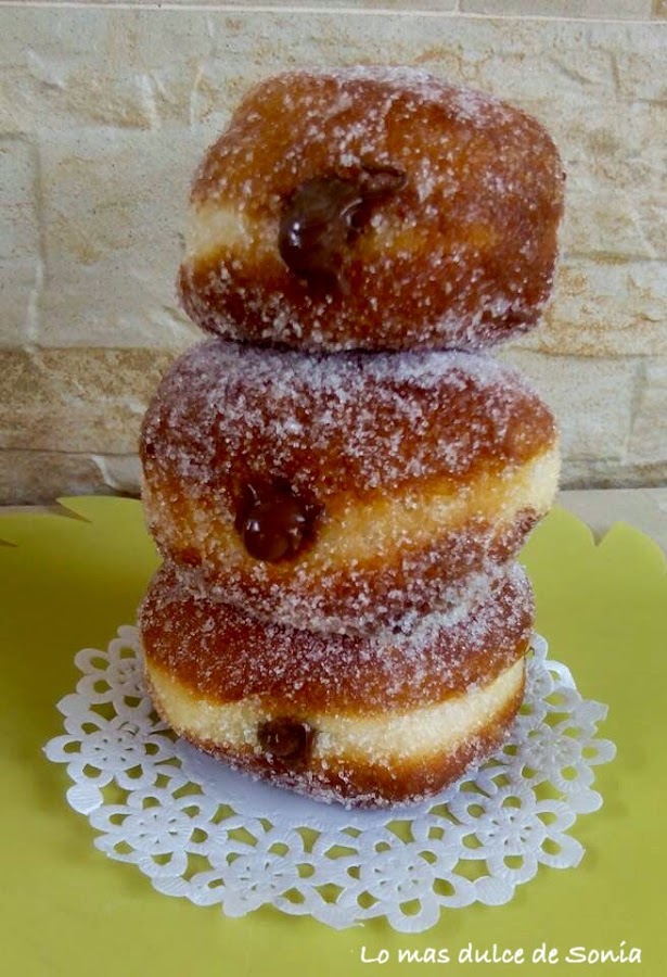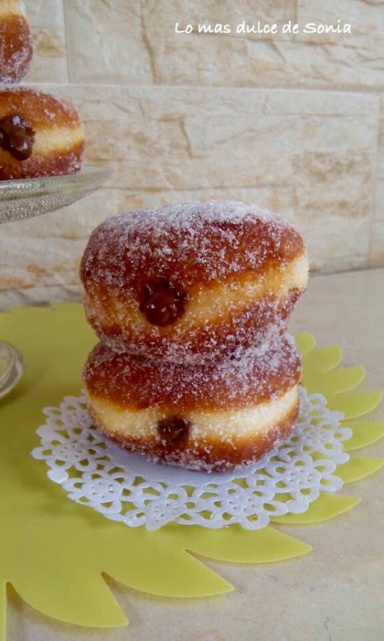 Desgasificamos la masa, dejamos 5 minutos y estiramos con un rodillo, dejando un grosor de unos 2 cm. Cortar las berlinesas con un cortapastas o un vaso. Colocarlas en una bandeja cubierta con papel de hornear o pincelada con un poco de aceite, un poco separadas unas de otras.