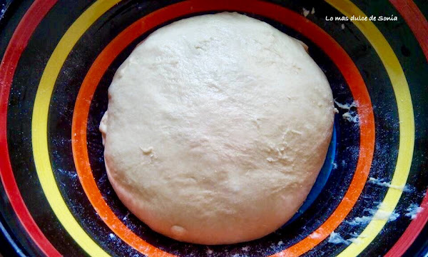 Ponemos la masa en la encimera o en un bol, espolvoreado con harina, amasamos ligeramente y hacemos una bola y tapamos con un paño. Dejamos unos 30 minutos ( yo deje mas rato, estaba haciendo varias cosas a la vez y deje más de una hora).