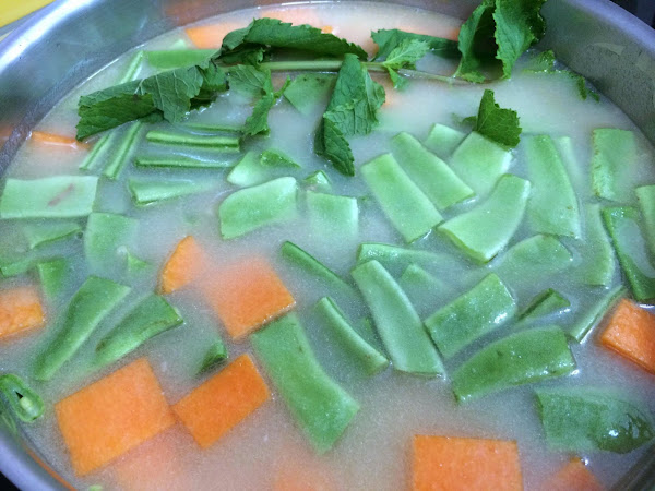 En el caldo ponemos un buen puñado de garbanzos sobrantes del puchero del día anterior y agregamos todas las verduras junto con una ramita de hierbabuena.