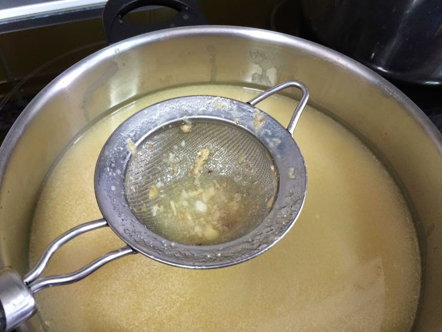 En una cacerola amplia ponemos caldo del puchero del día anterior y lo vamos limpiando de impurezas pasándolo por un colador.
