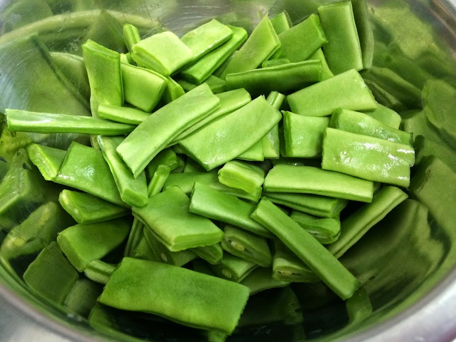 Lavamos y cortamos las habichuelas verdes.