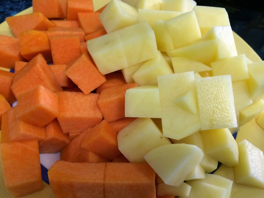 La calabaza y la patata se pelan, se lavan y se cortan en dados.
