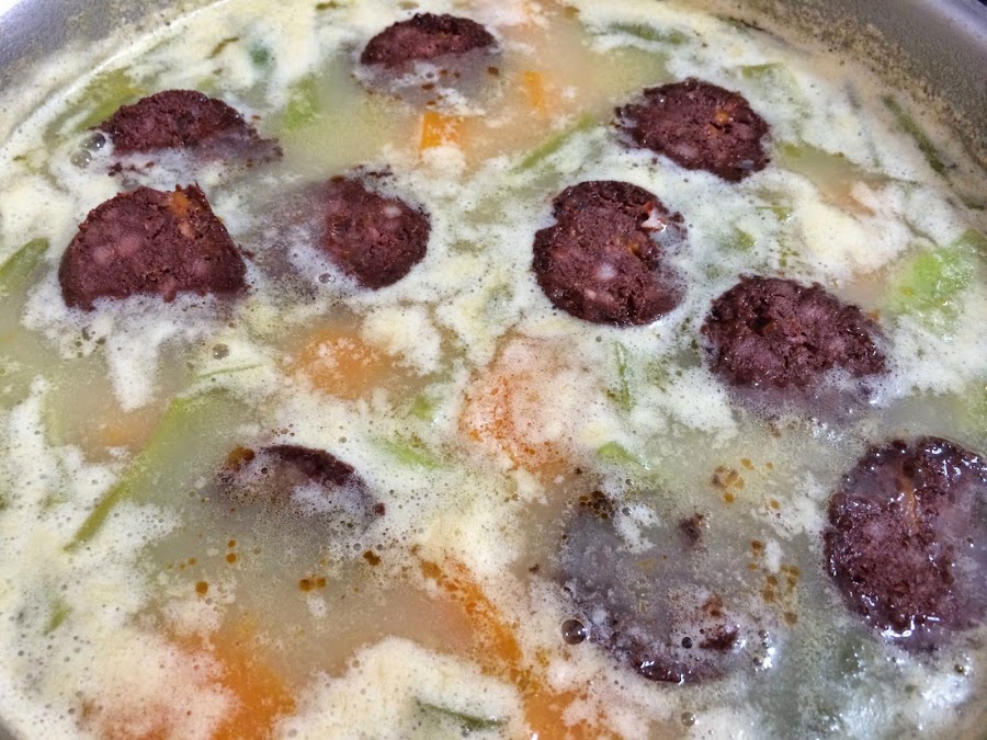 Dejamos que hierva a fuego medio hasta que las verduras estén hechas. En ese momento le añadimos la morcilla cortada en láminas. Hay quien también le gusta poner junto a la morcilla un poco de chorizo. Dejamos todo el conjunto un minuto al fuego y apartamos.