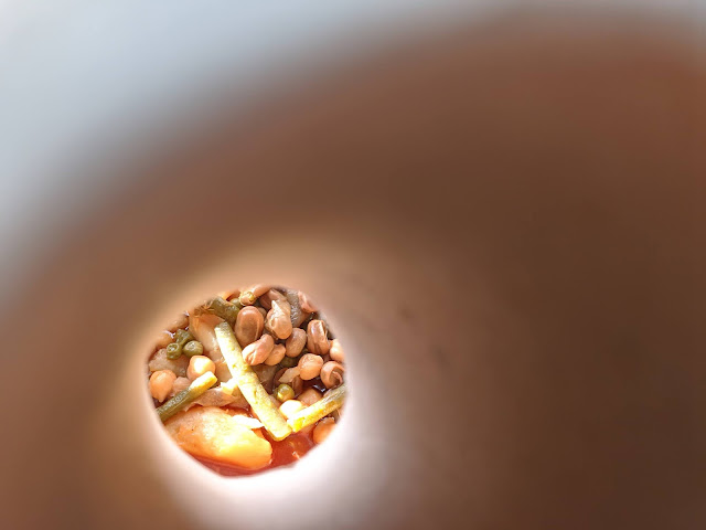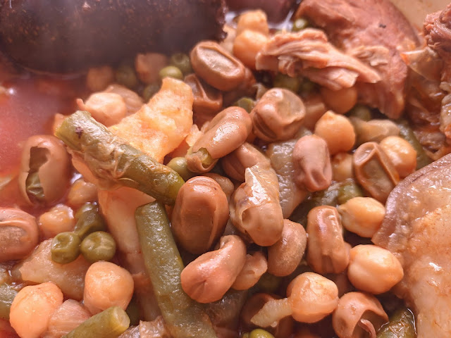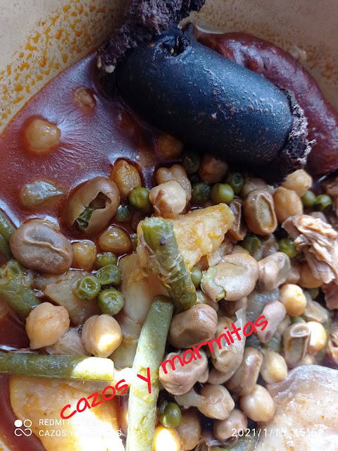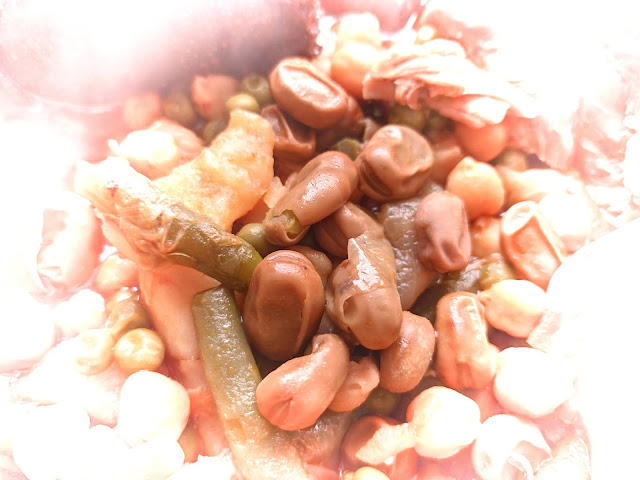 Dejar hervir un cuarto de hora y añadir los guisantes, las habas y las judías verdes.