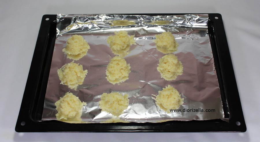Coloca la mezcla en bolitas con la ayuda de un "scoop" de mantecado pequeño o una cuchara, en una bandeja engrasada.