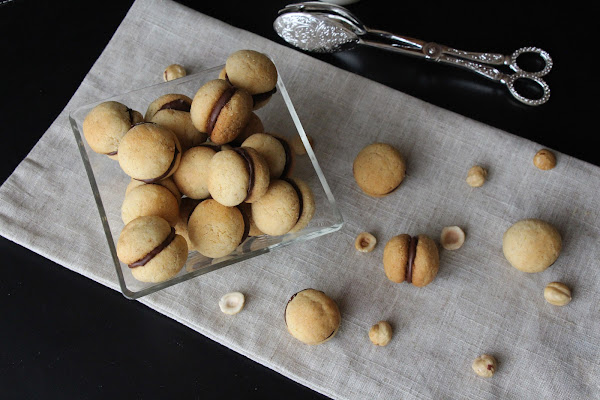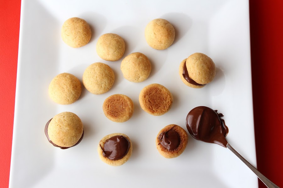 Derretir el chocolate del relleno, y una vez las galletas estén frías, untar la mitad de ellas con chocolate, que serán la base de los besos, y con la otra mitad, cubrir cada pasta ya untada, para cerrar.