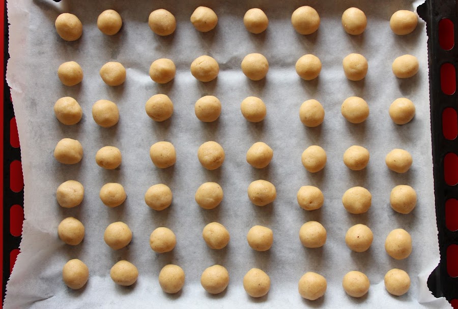 Coger pequeños trozos de masa de unos 8 gr e ir hacer bolas que colocamos en la bandeja del horno. Dejar separación entre unas y otras porque se expanden.