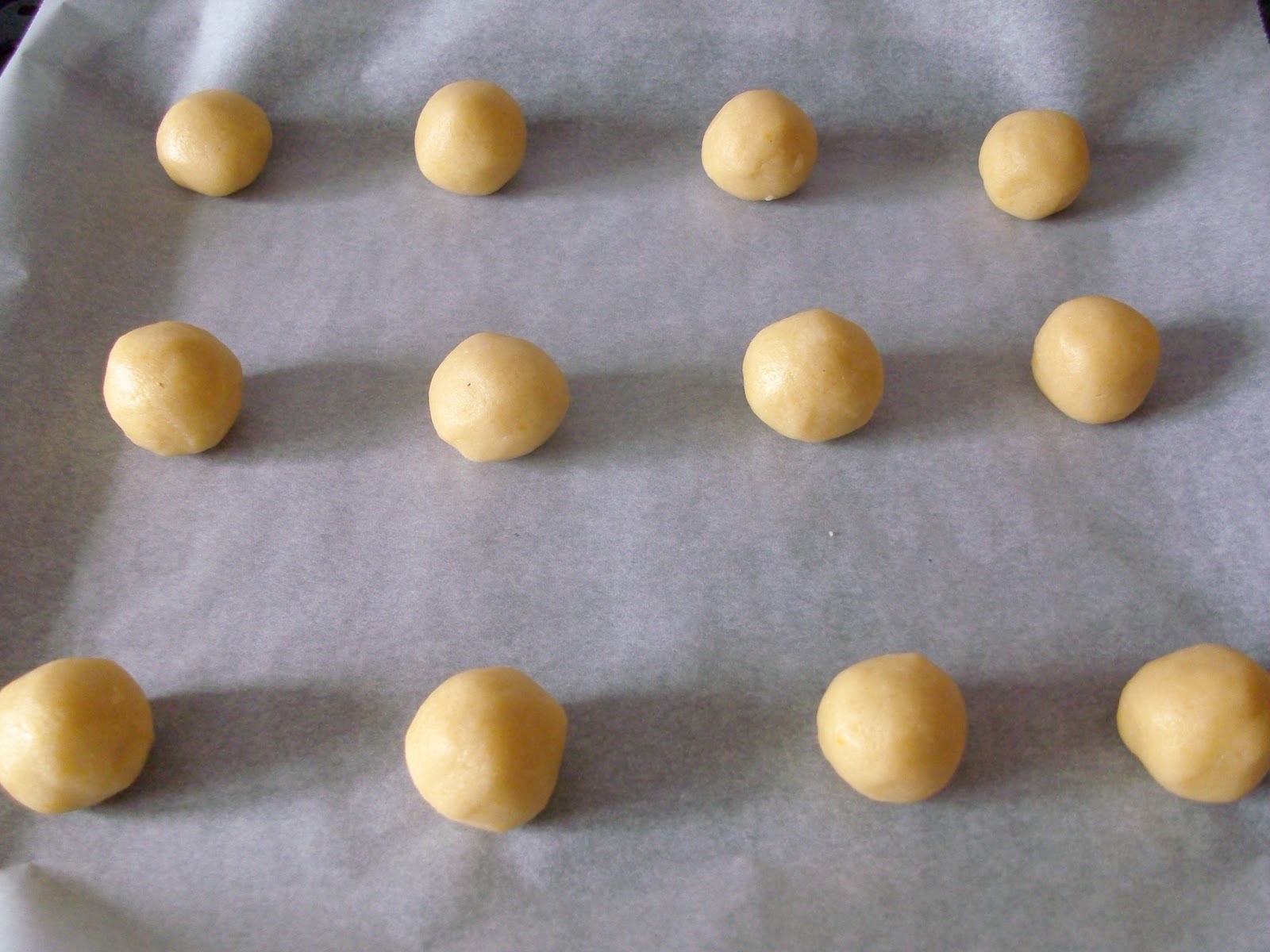 desenvolver la masa..separar trozos del tamaño de una nuez y darle forma con las manos de bolita