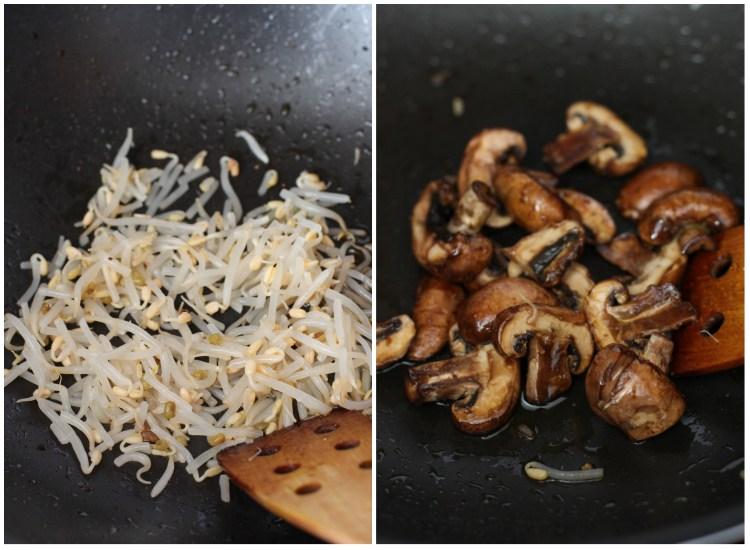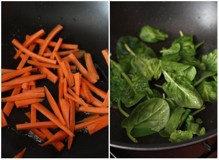 En un sartén o wok calentar 1 cucharada de aceite y saltear los bastoncitos de zanahoria durante 2 minutos, para que queden crujientes, reservar. Hacer lo mismo con los champiñones. En el caso de las espinacas y los brotes de soja saltarlos (por separado) durante 1 minuto, ya que se cocinan rápidamente.