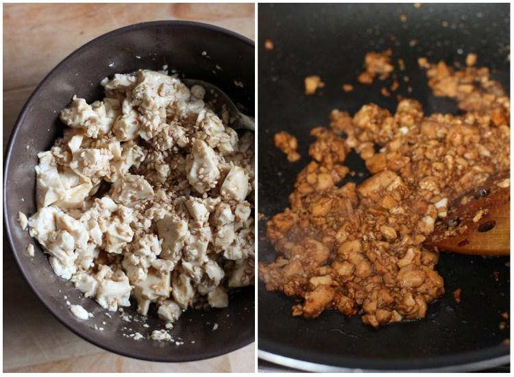 Marinar el tofu (o la carne) con 2 cucharadas de salsa de soja, 1 cdta de aceite de sésamo, 1/2 cdta de ajo en polvo y opcionalmente 1 cdta de mirin. Mezclar bien para que quede bien impregnado y saltear el tofu (o la carne) 5 a 7 minutos en el sartén o wok.