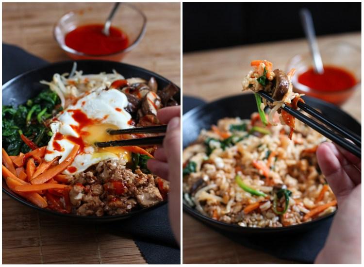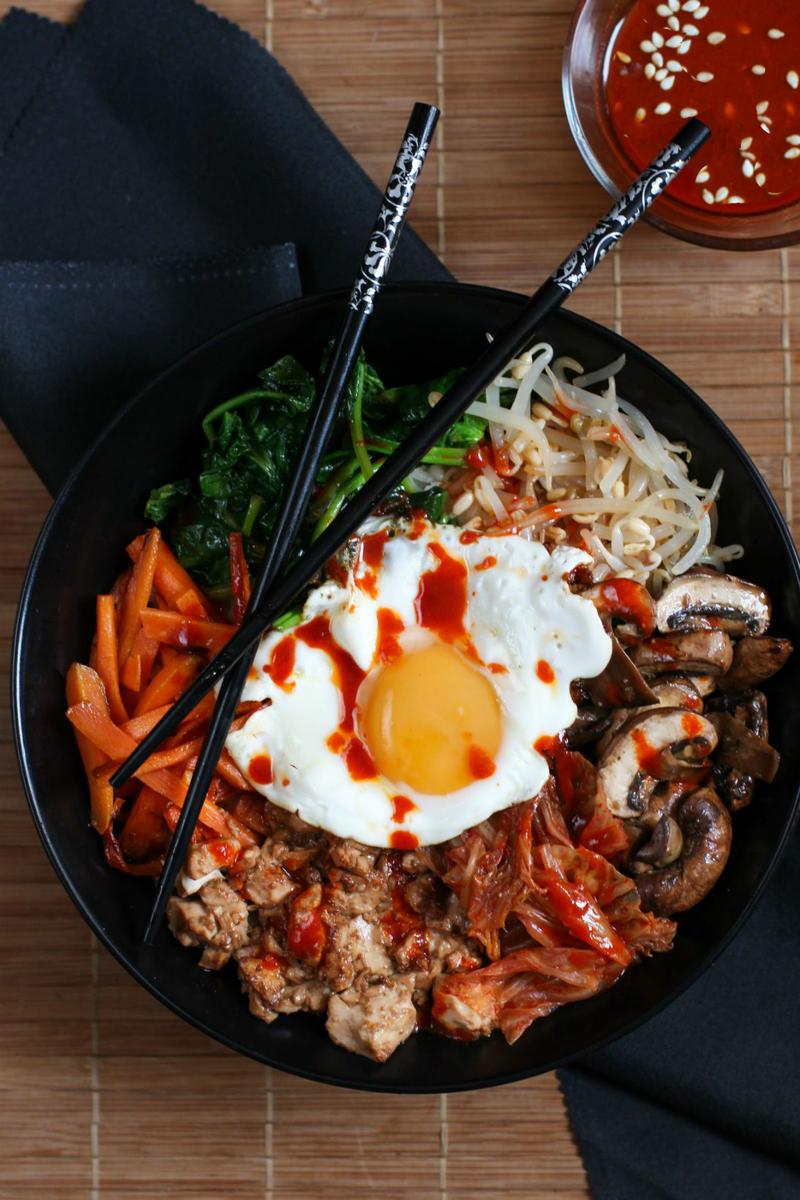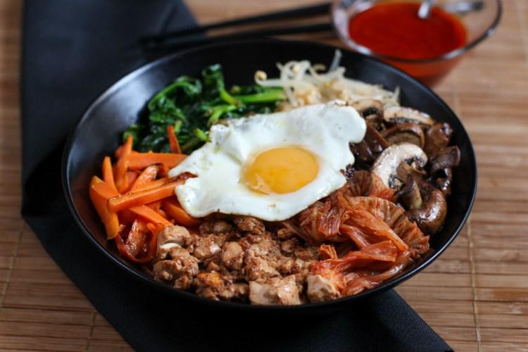 El bibimbap es un popular plato de la gastronomía de Corea que significa (literalmente) “arroz mezclado”. Consiste en un bowl (cuenco) con base de arroz blanco y que lleva por encima una variedad de vegetales, carne y huevo. Antes de comerlo se le añade una salsa en base a aceite de sésamo y gochujang (pasta de pimiento rojo picante) y se revuelve todo.