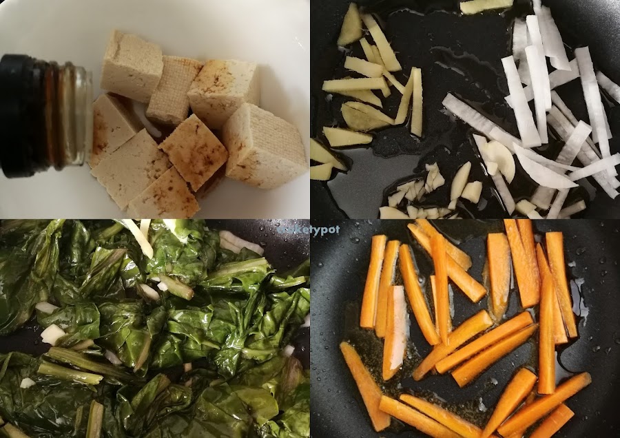 ELABORACIÓN: Cortamos el tofu y lo manrinamos en salsa de soja. Mientras preparamos el arroz basmati, usando un poco menos de agua de lo requerido y una cucharada de aceite de sésamo. El arroz para bibimbap debe estar un poco más seco de lo habitual para obtener mejores resultados.