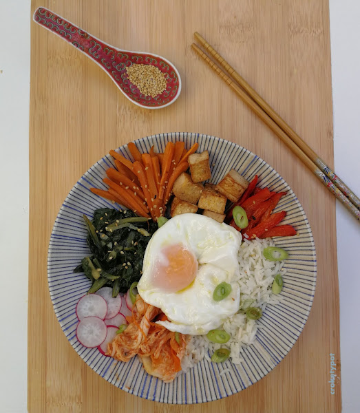 Bibimbap se traduce como " arroz mezclado con carne y vegetales variados ". Puedes realizar variaciones infinitas en este plato según tus preferencias de verduras y requisitos dietéticos, puede hacerse totalmente vegano, omitiendo la carne y el huevo, pero tengo que añadir que el huevo es una señal de identidad de este plato y otro elemento esencial es la salsa gochujang, que es picante, yo no le he puesto de esa salsa por que lleva kimchi y ya lleva suficiente.