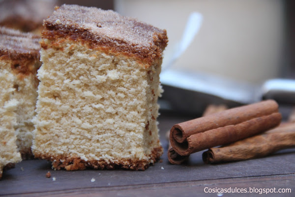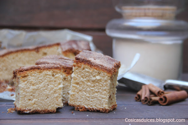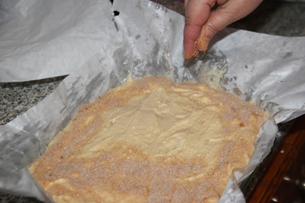 Ya solo nos queda verter la masa en un molde que no sea demasiado grande ya que la bica debe quedar alta y espolvorear con una capa muy generosa de azúcar y canela.