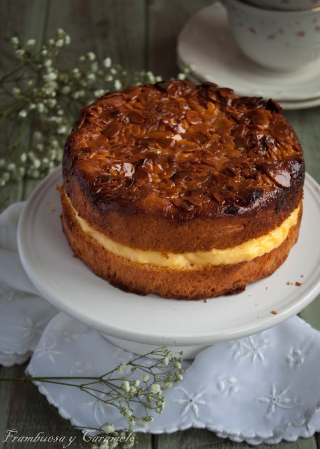 Es un pastel que necesita levado, antes de entrar en el horno se decora con un almíbar y almendras fileteadas, una vez horneado se divide en dos mitades y se rellena con crema pastelera o con nata (crema de leche) aromatizada con almendra. Que no os asuste que es muy sencillo. ¡¡Me parece estupendo para una merienda!!
