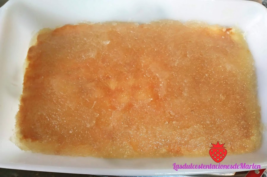 De este almíbar reservamos algo más de la mitad y con el resto calamos el bizcocho que tenemos en el molde.