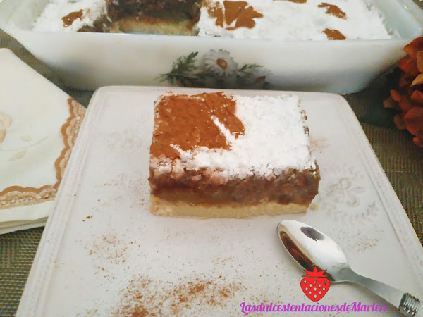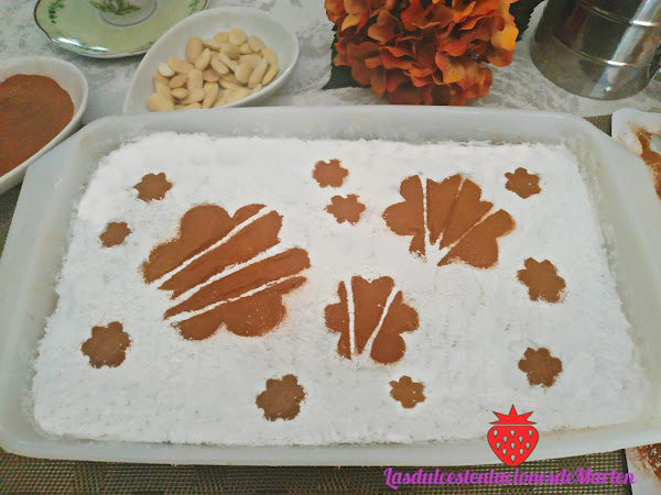 Ya solo nos queda dejarla enfriar y adornarla con una capa gruesa de azúcar glas, y hacer un dibujo con la canela. Yo he echo una plantilla con un folio y la he utilizado para adornar la bienmesabe con la canela.