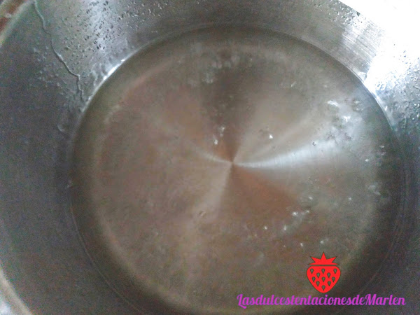 En un cazo ponemos el agua y el azúcar y cocemos (unos 5 minutos) hasta obtener un almíbar ligero (consistencia de jarabe).