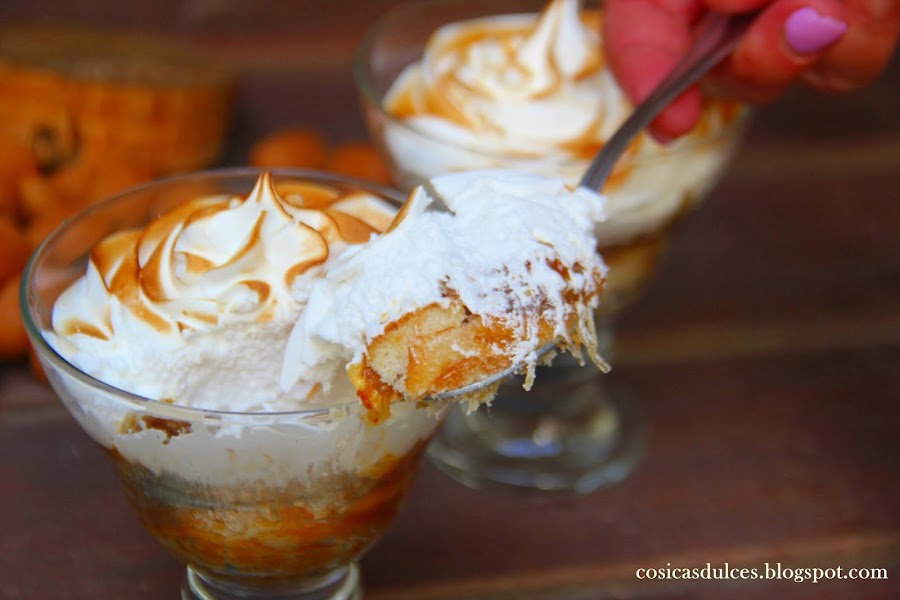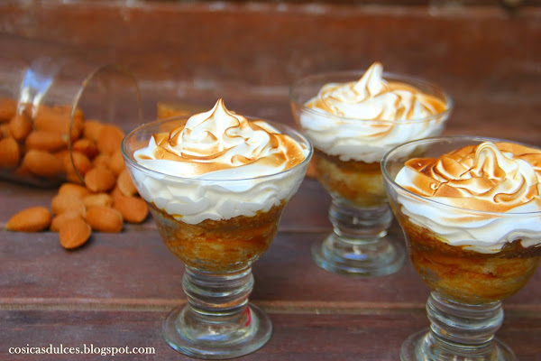 Por último elaboramos nuestro merengue suizo (receta AQUÍ) y coronamos nuestras copas con ayuda de una manga pastelera.
