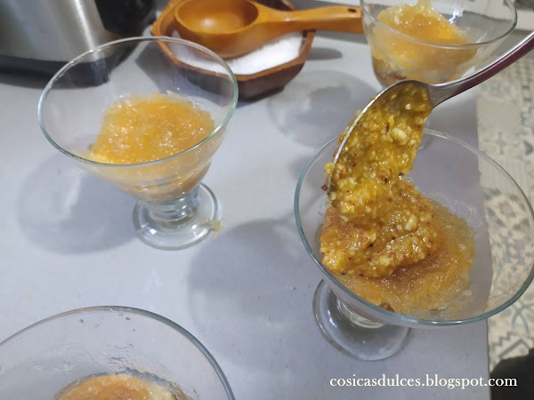 En las copas, sobre los bizcochos que ya tenemos colocados y calados, colocamos una capa generosa de cabello de ángel y una capa de la crema elaborada.
